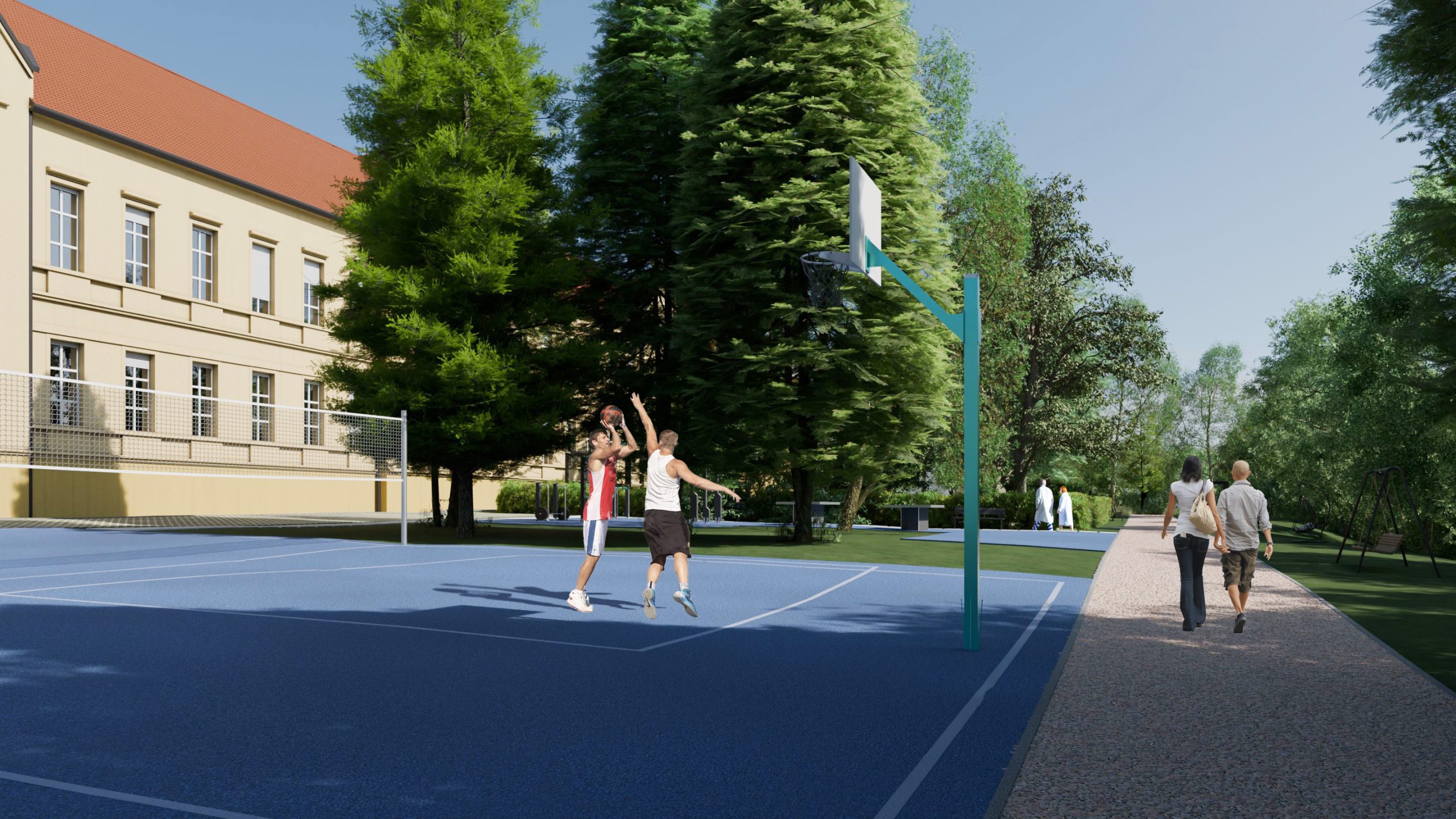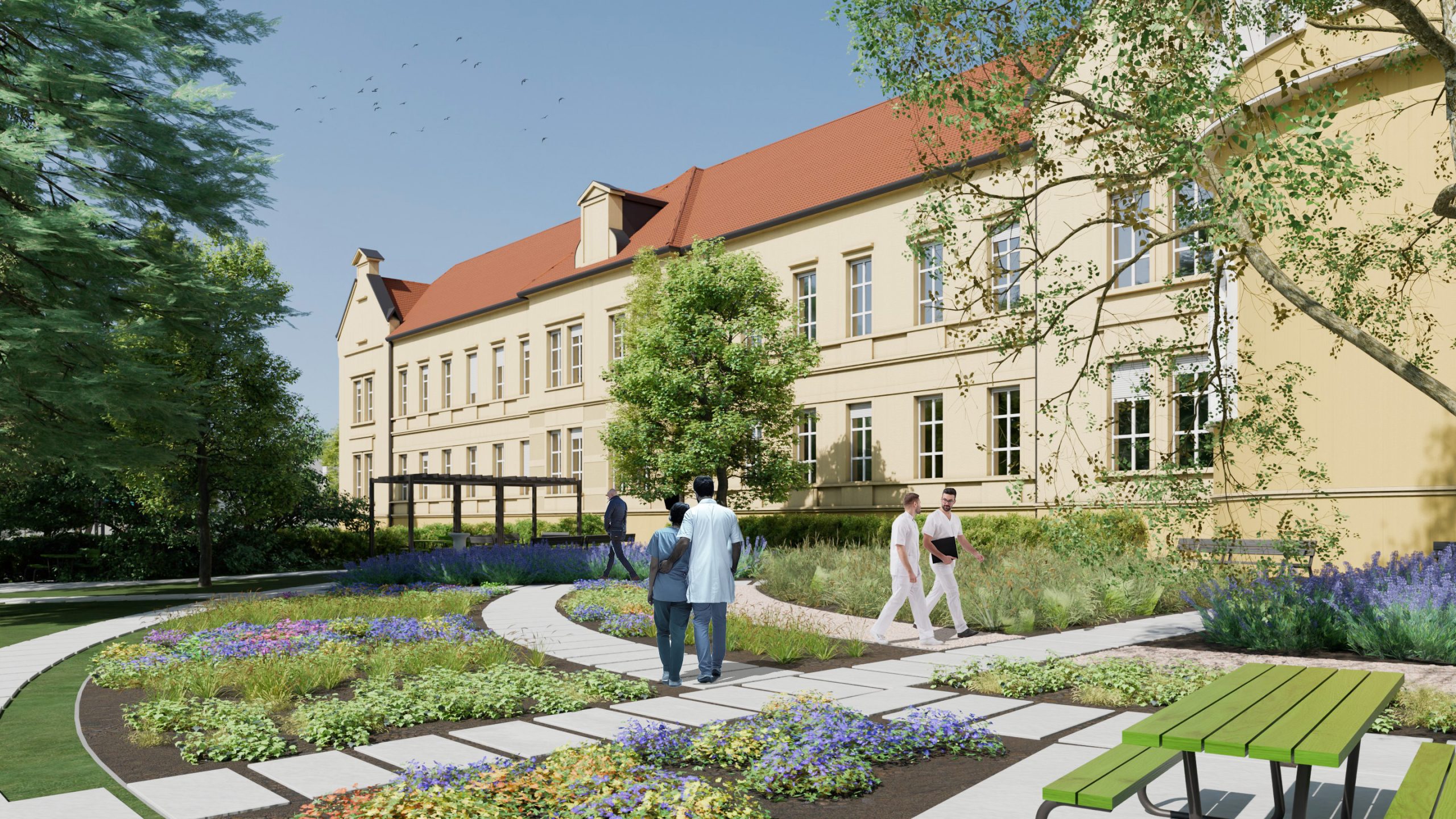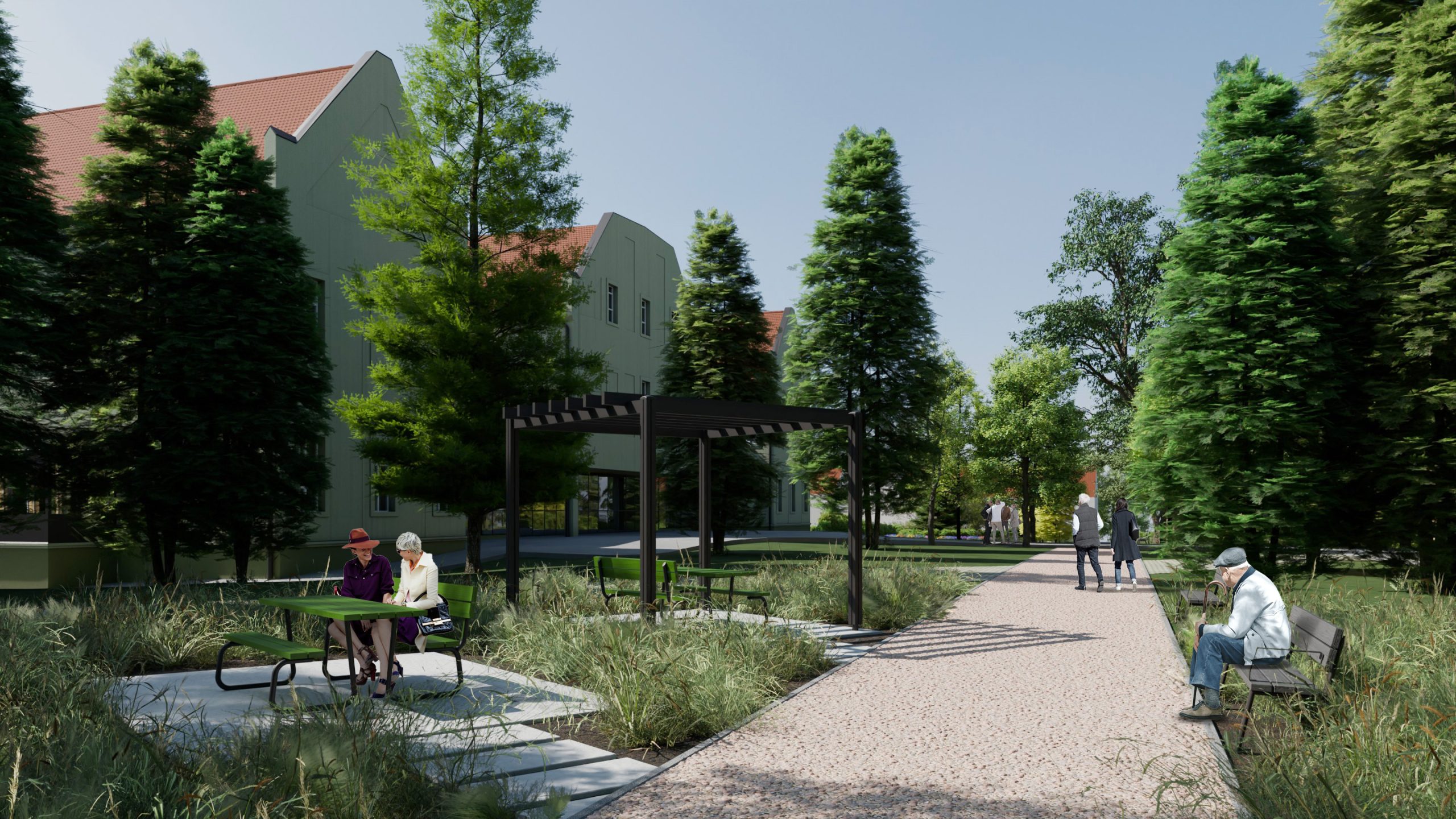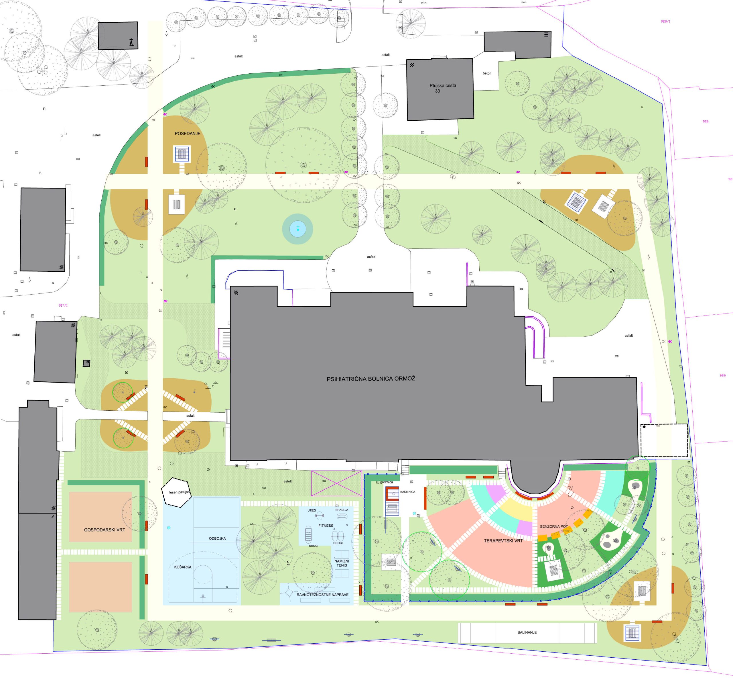 | Glavni cilj načrtovane ureditve je ponovna vzpostavitev parka okoli osrednje bolnišnične stavbe. Avtomobilski promet v okolici stavbe se omeji na minimalni potrebni obseg in ureja podrejeno. Osrednji element ureditve je krožna pešpot, širine 3 m, ki poteka sklenjeno okoli stavbe. Z dolžino cca. 400 m omogoča kvalitetne sprehode, hkrati pa se preko nje dostopa v vse programe, ki so umeščeni v bolnišnični park. Ob krožno pot se umestijo območja za posedanje in zadrževanje (4x), športno-rekreativna površina, gospodarski vrt ter terapevtski vrt. |